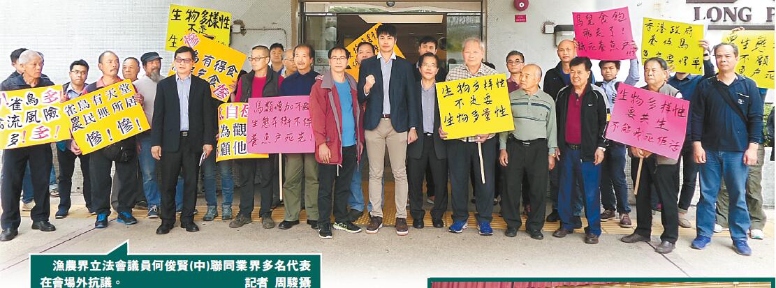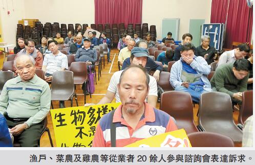當日,漁農界立法會議員何俊賢聯同香港農業聯合會、新界養魚業協進會、新界養雞同業會、新界本地農協會、港九漁民聯合會及香港漁民團體聯誼會等主席及漁戶、雞農、菜農從業者20餘人,於諮詢會前展示「抗議政府漠視本地漁農業生物多樣性慘變雀鳥多『量』性」橫額請願。與會的漁戶、雞農及菜農代表發言,直斥「計劃」對漁農業的宣傳嚴重不足,而「計劃」未有列出漁農界,完全漠視漁農界這個重要持份者,正反映政府政策傾斜。
