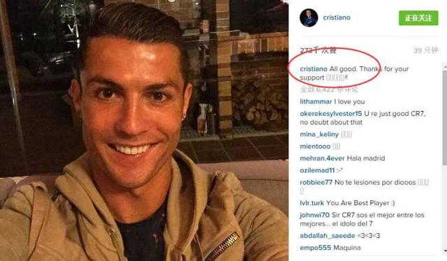 腾讯体育4月21日讯 在今天凌晨结束的西甲联赛焦点战上,皇马(数据) 3-0力克比利亚雷亚尔,虽然赢球,但是C罗在比赛中伤退,这还是让不少皇马球迷牵肠挂肚。不过在个人INS上,C罗向球迷们“报平安”,看起来,葡萄牙球星伤无大碍,不会缺席周末的联赛和下周中的欧冠半决赛。 皇马战胜比利亚雷亚尔一战,在终场哨响前,C罗禁区内试图倒钩,但却被身体更为强壮的巴伊撞倒。起身之后,C罗不断抚摸着自己的右大腿后侧肌肉,而且露出了痛苦的表情。实在无法坚持的葡萄牙前锋提前2分钟退场,看到C罗离开球场之后,齐达内一脸铁青,在赛后接受采访时,齐祖也表示后悔未提前换下C罗。 让皇马球迷宽心的是,在Instagram上,C罗贴出了自己一张有着灿烂笑容的照片,而且附上文字,“一切都好,谢谢大家的支持。”从这样的讯息来看,C罗应当无大碍。这位皇马头牌球星应该不会缺席周末的联赛和下周中的欧冠半决赛,而皇马的对手分别是巴列卡诺和曼城(数据) 。 本赛季,C罗的状态非常火爆,目前在西甲和欧冠分别打入31球和16球,他的重要性对于皇马不言而喻,看起来齐达内和皇马球迷都将松口气。 (烟圈)