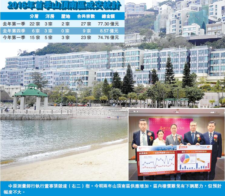 而中原豪宅STATELYHOME山頂南區董事兼大中華高端物業香港辦公室總經理何兆棠亦指,現時區內業主持貨能力較高,加上有部分買家已開始趁樓價調整入市,因此預期在市場需求帶動下,今年區內樓價跌幅僅限於10%以內。