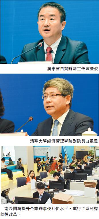 白重恩表示,經過評估之后,清華發現廣東自貿區在制度創新上取得了很大的進展,實際成效也有很大的進展。在制度創新方面,包括與國際高標準對接的投資、貿易、規則體系初步形成,若干制度創新具有全國推廣價值;依法規範運行高效電商的服務行政獲得企業的高度認可;在金融領域開放方面也取得了若干突破;在服務國家戰略方面初見成效;新型高端業態集聚發展這方面也做了很大的努力,取得了成效。比如國家戰略方面,「一帶一路」是自貿區發展要考慮的一個非常重要的要素。還有若干個具有自貿區特色的經驗,為自由貿易試驗區未來發展提供動力。此外,給清華留下很深印象的是,3個片區都非常積極主動探索各方面的問題,然后以問題為導向來加快制度的創新,還包括用互聯網思維打造高效的電商服務型政府,在投資便利化化水平方面都得到了顯著的提高。