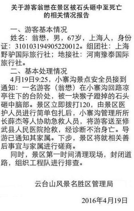 “4月19日9时25分许,小寨沟景区安全员接到通知:一名游客(翁懋)在小寨沟回路凉亭往下的台阶处,被一块猴子蹬掉的石头砸中脑部。景区立即拨打120,由景区医护人员进行简单包扎后,小寨沟管理所所长薛杰等人协助急救人员,将游客送至修武县人民医院抢救,经诊治不治身亡。导游已通知其家属。下步,景区将就相关善后事宜与家属进行磋商。