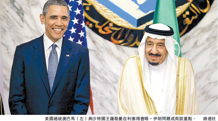 20日,奧巴馬與沙特國王薩勒曼在利雅得舉行雙邊會晤,伊朗問題被認為是商談的重點之一。美國與沙特關系近期出現緊張,奧巴馬早前接受訪問指,不少中東國家在安全問題上依賴美國,又認為沙特應與伊朗保持睦鄰關系。當天,在兩人會晤前,美國防長卡特和海灣阿拉伯國家合作委員會(海合會)秘書長扎耶尼宣布,美國和海合會成員國將開展海上聯合巡邏,阻止伊朗向也門輸送武器。21日,奧巴馬與海合會6國領導人舉行峰會。