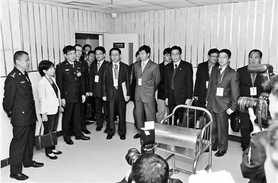 臺灣代表團在大陸公安機關有關人員陪同下,參觀羈押臺灣嫌犯的北京市海淀區看守所