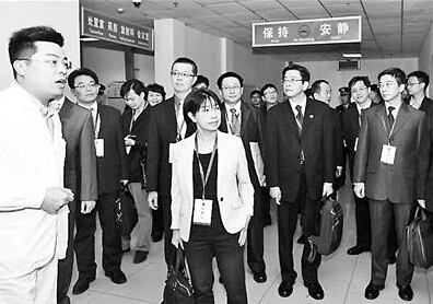 今天上午,臺灣代表團一行10人在公安部相關人員的陪同下,來到北京市公安局海淀分局看守所,他們首先參觀了看守所內律師會見犯罪嫌疑人的地方,然后又來到總監控值班室,通過實時視頻觀看了劉泰廷等臺灣犯罪嫌疑人被提訊的情況;隨后,代表團一行又來到看守所的醫療中心,參觀了輸液室、急診室、藥房等處;在訊問室,海淀看守所的負責同志向臺灣代表團詳細介紹了提審犯罪嫌疑人時,詢問室全程監控,全程錄音錄像的情況。