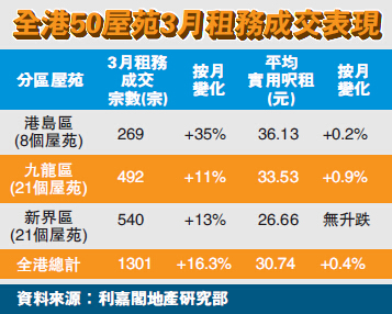 【香港商報网訊】記者曾展榮報道:香港樓價連月回軟下,不少準買家選擇轉買為租,促使二手屋苑租金有回升跡象。利嘉閣地產研究部主管陳海潮表示,綜合利嘉閣地產研究部數據所得,今年3月份全港50個指標屋苑的加權平均實用尺租報30.74元,按月回升0.4%,為自去年9月起連跌6個月后首度回升。