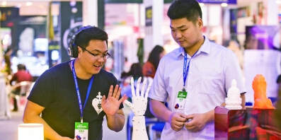 工業設計展區展出的可以模仿手指伸出數量的手臂。南方日報記者 孫俊杰 攝