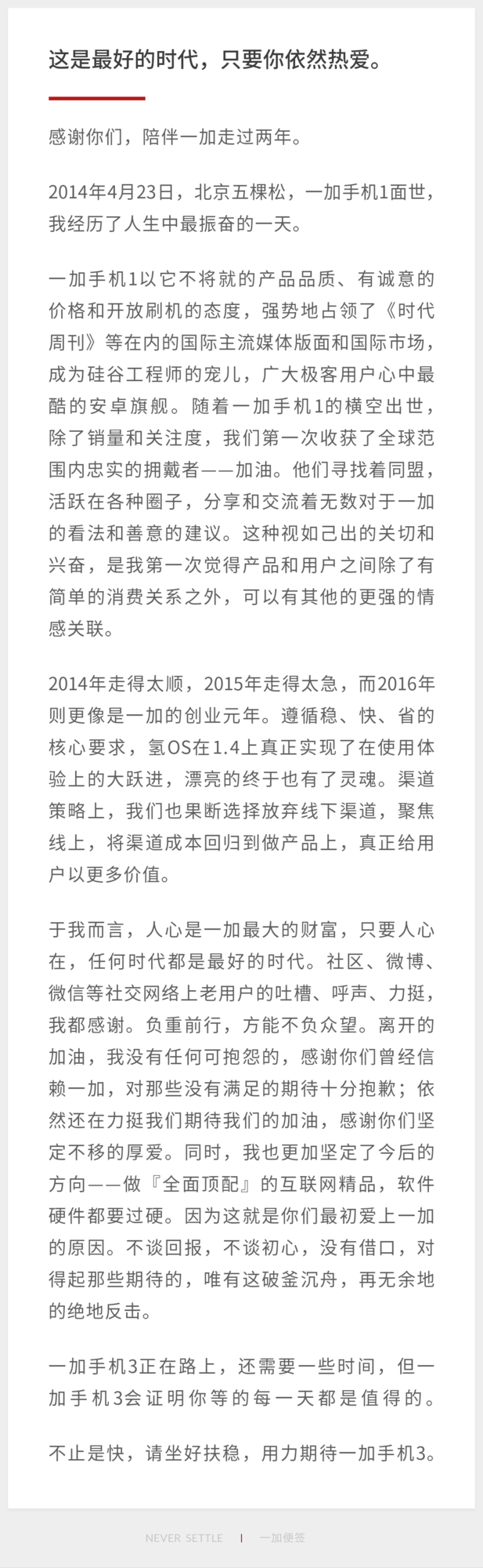 劉作虎發布了一條長微博,名為《這是最好的時代,只要你依然熱愛》。原來明天(4月23日)就是一加手機一代發布兩周年的紀念日。