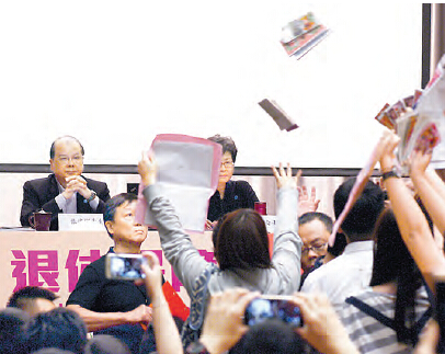 此外,是次退保諮詢會遭多名示威者打斷,更有支持全民退保的示威者向林鄭投擲陰司紙。林鄭於最後總結發言指,雖然於公眾諮詢時經常被辱罵,但仍樂意出席聆聽市民意見。她對於有人利用平台達到政治目的感傷感,直言於政改諮詢、退保諮詢等不同場合,均是被同一班示威「常客」狙擊,質疑這批示威者是否真正愛香港。她又指,香港是多元社會,不同人有不同意見,但互相尊重是香港其中一個可貴的地方,希望往後出席公眾諮詢時出現暴力行為及肢體衝擊情況可以減少。