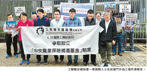 【香港商报网讯】记者戴合声报道:4月28日为「国际工伤纪念日」,工联职安健协会於纪念日前夕发起游行,要求政府尽快设立「中央职业保险补偿局」,推行「中央职业保险补偿基金」制度,为全港雇员提供职业工伤补偿的功能,并为各行业雇员,提供康复治疗。协会又呼吁雇主,要切实履行保障雇员职业安全健康的责任,投放资源培训员工,提供保障雇员职业安全健康的设施及工作环境。