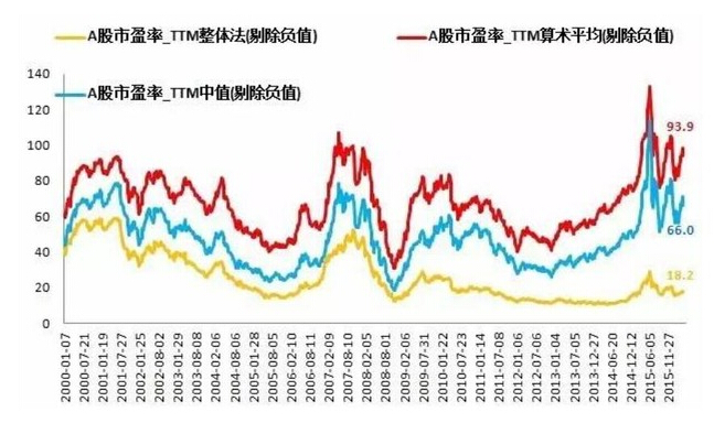在我們的路演中,發現目前對市場長期趨勢還持樂觀態度的人,一般是那些去年“股災”以來倉位就一直很低的投資者,他們在躲過了三輪“股災”之后,其實也忍不住想要入場“吃口飯”了。但擺在他們面前的一個現實問題是——即使經歷了三輪“股災”,居然還是找不到基本面好估值又便宜的股票,因此無從下手。這些投資者面對的問題用下圖可以很直觀地表現出來——雖然目前A股整體的PE只有18倍,確實已經回落到了比較低的位置,但是如果看算術平均的PE卻高達94倍,看PE中值也高達66倍,都還處在歷史高點上,遠未到“正常水平”。我們都知道,估值是“快變量”,盈利是“慢變量”,因此進入股市的長期資金往往都是賺盈利的錢,而不是賺估值的錢,他們只會在估值中樞比較穩定的時候才會進場,否則估值的大幅波動會完全抹殺掉盈利擴張的收益,現在來看還沒到他們要進場的時候。