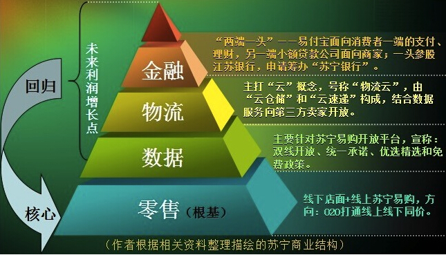 2014年,蘇寧春季部署會提出的是“一體兩翼”互聯網路線。其中“一體”是以互聯網零售為主體,而“兩翼”則指打造O2O的全渠道經營模式和線上線下的開放平臺。