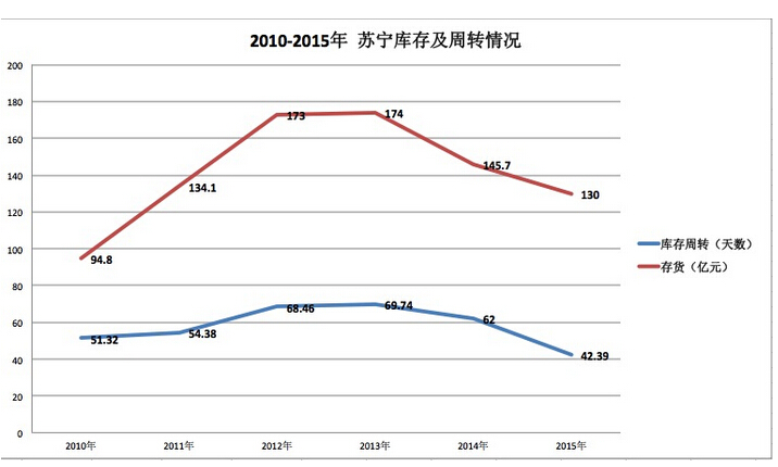 2013年開始,蘇寧庫存及周轉率得到改善,得益于當年的寧易購開放平臺與采銷分離,與京東商城的模型很相似——將開放平臺作為中心,成立團購體系,建立研發中心。另一因素,蘇寧易購與蘇寧電器(線上線下)采購統一,以及擁有數據積累分析指導科學采購決策,但這是階段性的體現。下一階段,蘇寧要加速“去家電化”,向服飾、生鮮、日百等品類擴張,庫存增加的機率也不低。