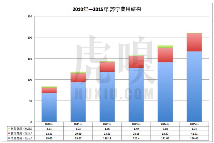 過去六年,蘇寧期間三費的“費用率”從2010年的10.36%提升到2015年的15.72%,漲幅最明顯的還是銷售費用,最主要的是市場投放的加大,做品牌、為線上買流量,比如贊助《跑男》;還有一個因素是訂單數量的增加,相應增加了運雜費。