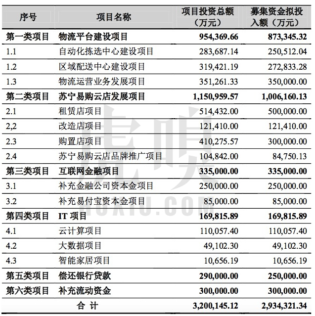 蘇寧定增募集的293.4億(含阿里283億投資)主要用于蘇寧易購IT、物流、金融等基礎設施建設,于實際預算320億還相差26.6億,這并不是什么問題,蘇寧2015年末手頭持有現金及現金等價物約168.2億,完全有能力補齊項目款。