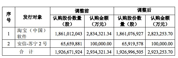 蘇寧與阿里簽署的《投資協議》規定,阿里將用境內子公司“淘寶(中國)軟件”身份,以15.23元/股的價格(4月25日,蘇寧發布《2015 年度利潤分配方案后調整非公開發行股票發行價格和發行數量的公告》在利潤分配后,本次非公開發行股票的發行價格將由 15.23 元/股調整為 15.17 元/股)認購蘇寧約18.6億股非公開發行新股,而本次蘇寧定增股數約19.3億股。