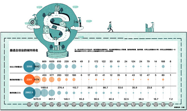 商業活力城市排名統計時間為2015年全年。商業活力總分=(公司數量指數*0.7+創業指數*0.3)*(1+高校系數),其中創業指數根據36Kr數據綜合計算;高校系數由高校數量系數化后得出。