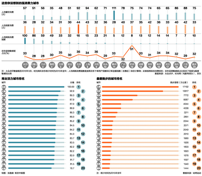 在“未來可塑性”這一維度下,有一些沒想到的強消費力城市。這些城市按綜合消費排名,前10位的城市分別為:長沙、石嘴山、蘭州、衡陽、日照、延邊、北京、上海、沈陽、包頭。數據來源為:大眾點評數據截至2016年3月,時光網和京東統計時間為2015年全年;人均網購消費指數是按照京東下單用戶指數和訂單金額指數(優惠后)綜合計算而得。