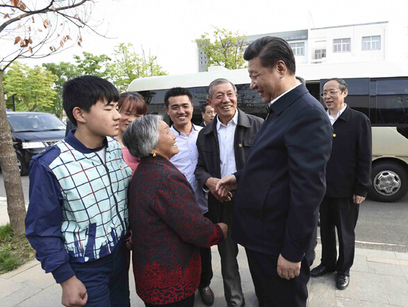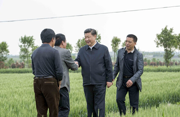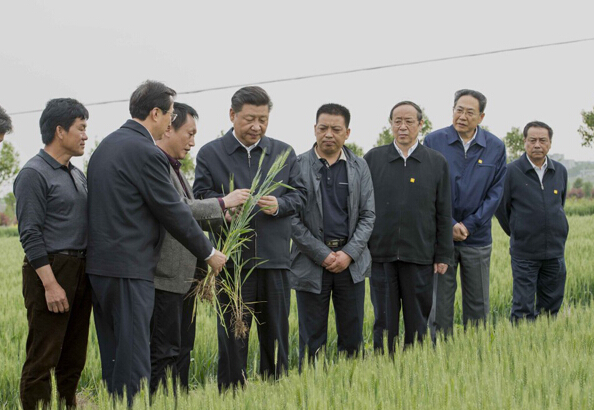 25日下午,習近平來到小崗村4300畝高標準農田示范點,沿著田埂走進麥田,察看小麥長勢,向村干部、種糧大戶和農技人員了解土地流轉、農田整理、種植品種、畝產量、病蟲害防治、糧食收購等情況。聽了大家介紹情況,總書記說,現在正值抽穗灌漿的關鍵時期,要加強田間管理,實現豐收,今年的白饃能吃到嘴里了。