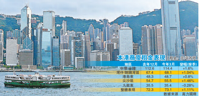 除了物业买卖外,中资机构亦活跃於本港租赁市场,其中不少内地企业选择中区作为「落脚地」。据戴德梁行数据显示,今年首季中资金融机构的租赁个案占了中区新签租赁面积的49%,直接撑起了区内商厦租金增长。而高力国际昨日发表的报告亦指出,今年首季本港整体商厦租金为每平方尺73.1元,较去年第四季微升1.1个百分点,当中尖沙咀升幅较大,按季上升约1.46%;其次为深受中资机构追捧的中区,租金按季增长1.33%至114.1元。