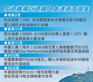 事实上,不论内地投资者或中资机构,历来对本港商厦物业情有独锺,更不时可见巨额成交个案。有资料显示,单是去年11月,市场便连录两宗来自中资机构的大额买卖个案,包括中国人寿保险(海外)股份有限公司(国寿海外)购入会德丰(020)旗下红磡红鸾道18号楼花商业项目「One HarbourGate」西座,涉及成交金额高达58.5亿元。而在同月,内房「大佬」恒大(3333)亦豪掷125亿元,将华置(127)位於湾仔的美国万通大厦全幢收归旗下,成交金额更一度创下本港单一商厦新高。
