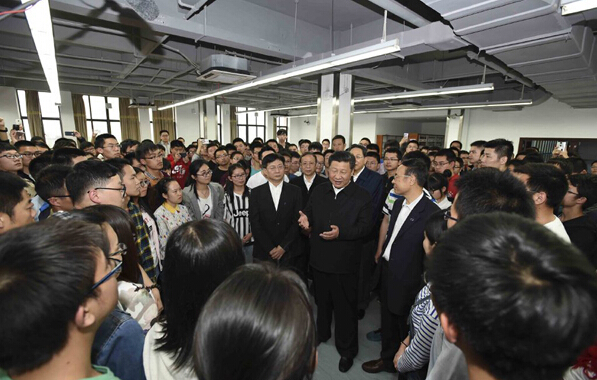 4月26日下午,習近平總書記來到中國科技大學圖書館自習室。見到總書記來了,學生們圍攏過來,爭著向總書記問好。“家是哪里的?一個人來合肥上大學爸媽放心嗎?”“國防班有多少人?招生時就定向了吧?”“去西部地區支教這一年感受很深吧?農村的孩子,不忘初衷。”“在圖書館學習覺得氛圍很好吧?還得早點來占個座?”總書記同身邊的學生愉快交談著。大家你一言我一語回答總書記提出的問題,談自己的大學生活,講人生的目標理想。