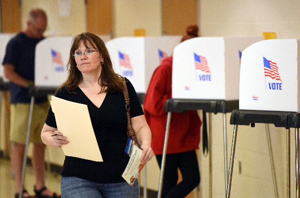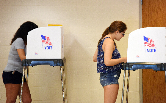 4月26日,人们在美国马利兰州蒙哥马利县一所学校设立的投票点参加总统大选两党初选投票。