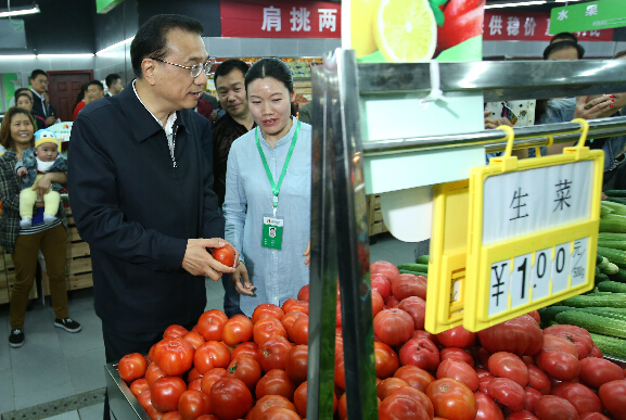 正在四川考察的中国国务院总理李克强26日上午走进成都市益民菜市东苑店,看“菜篮子”供应,询问肉价、菜价涨跌,于市场末梢中了解物价情况。