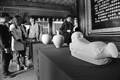7件作品中,仿北宋定窑白釉孩儿枕是中国工艺美术大师陈文增依样而造的仿制品。婴孩匍匐于椭圆形床榻之上,面部丰盈,双目炯然,身着开衩长袍,外罩坎肩,下着长裤,双脚交叉扬起,颇显顽皮可爱。专家介绍,传世北宋定窑白釉孩儿枕共计有三件,一件现藏于故宫博物院,另两件现藏于台北故宫。