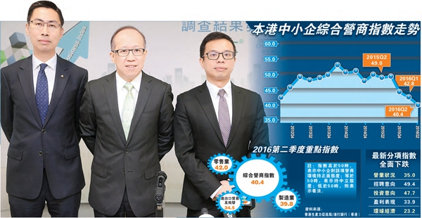 【香港商報網訊】記者鍾穎琳、實習記者張芷瑜報道:昨日,香港生產力促進局公布本年度第二季「渣打香港中小企領先營商指數」。調查指出,港中小企綜合營商指數連跌三季至40.4,并創過去三年來新低。相關數據反映中小企對未來前景看淡,其中近20%受訪者更表示若經濟不景情況持續,不排除公司或於一年之內結業。三大行業中,零售業受影響最深,有近28%受訪企業表示如經濟於未來一年持續低迷將面臨結業危機。