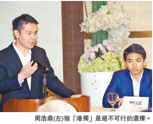 【香港商报网讯】记者李淇报道:香港回归至今,一国两制下的香港近年出现对《基本法》及「一国两制」不同的解读;并引发不少争论和冲突,直接影响落实普选的进程及香港管治效率。昨日的「一国两制与本土思潮」研讨会上,有港独分子声称港人是「独立民族」,未来会有更多年轻人支持独立云云。不过,有份出席研讨会的民建联副主席周浩鼎就直斥「港独」是绝不可行的选择,认为香港应在「一国两制」下依法解决问题。