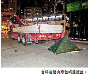 【香港商报网讯】记者何家骅报道:继前日连续发生两宗重型车辆辗毙老妇惨剧後,昨日再有1名八旬老妇於大角咀被吊臂货车撞倒卷入车底辗过,当场重伤死亡,为两日以来第3宗同类事故。