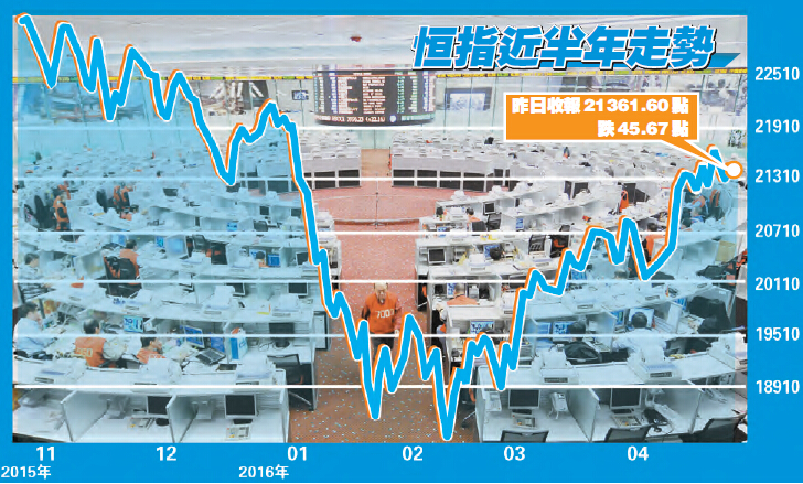 【香港商報网訊】記者伍敏報道:步入次季度,美國加息步伐迫近,市場關注環球金融市場勢再翻起巨浪。港股昨於議息之前繼續維持窄幅上落格局,收跌45點,報21361點,後市料10天線(21365點)失守機會大。主板成交按日縮12%至549億元。