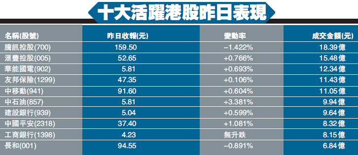 國際銀行股跑贏,渣打業績勝預期,一度飆逾8%,收市升逾半成報62.7元,重上60元關;控升0.7%報52.65元。港交所(388)再失200元關口,跌0.6%,報199.2元。騰訊(700)亦未能企穩160元關,跌1.4%,報159.5元。