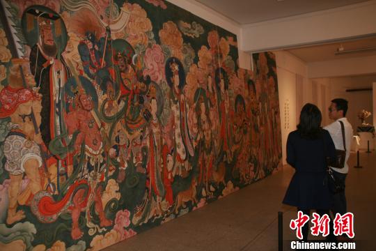 “中央美术学院首届宗教绘画高研班作品展”23日在中央美院教学展厅开幕,一件1:1比例复制的明代宫廷《法海寺壁画》极为震撼。 杨彦宇 摄