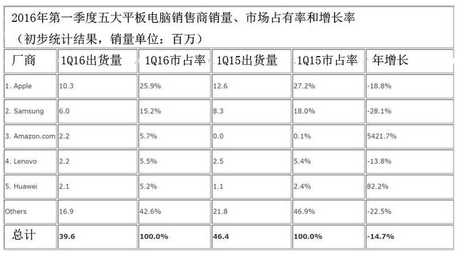 在出貨量排名上,蘋果和三星依然穩坐第一和第二把交椅。IDC公司稱,2016年第一季度,全球平板電腦的下滑主要是因為“季節性下滑”和“整體表現冷淡的消費者群體”。前五大平板電腦供應商占全球平板電腦市場57.4%的份額,較去年同期的53.1%所有增長。