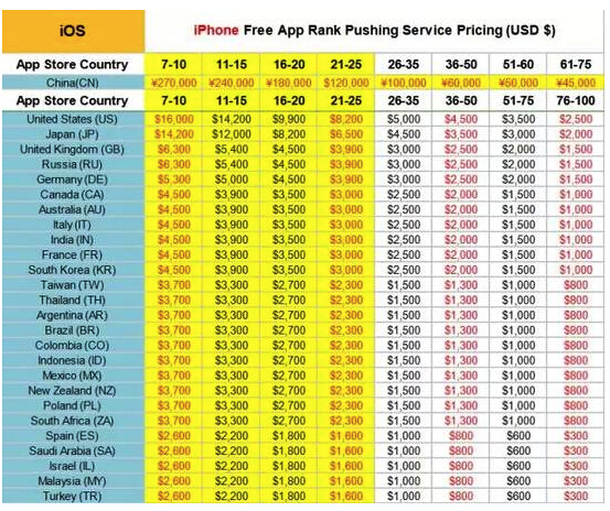 曾有媒體爆出App store排行榜各國刷榜報價,中國區7-10名的刷榜價格即達到了27萬元/天,而對比下來,美國區7-10名僅為1.6萬美元、合人民幣才10萬,日本則為1.42萬美元,中國區的價格竟然為美國、日本區的3倍。