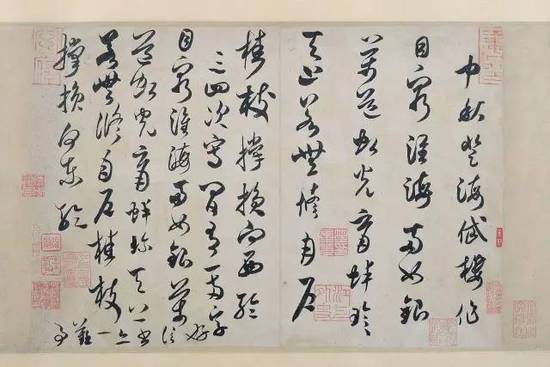 米芾的几件名作均有刻画太甚的笔病,而他的手札却做到了以势为主,使转自如,无挑剔之病,米芾晚年似乎明白了这个道理,“老无他物适心目,天使残年同笔砚”,书风较中年有所收敛,有晋魏平淡的趣味了。“既老始自成家”。米芾说“唐太宗学右军不能至……故大骂子敬”,而他自己呢,由于用力学习王羲之而达不到那个“入晋人格”目标,晚年也就大骂“二王”了。 (来源:藝術聯盟)