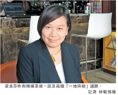 經民聯立法會議員、大律師梁美芬昨日與傳媒聚會,談及高鐵「一地兩檢」議題。她稱,日前與全國港澳研究會副會長、基本法委員會委員饒戈平會面,雙方主要都是討論「一地兩檢」。她說,根據自己觀察,認為內地法律專家對於「一地兩檢」仍持開放態度,並非抱著要強硬推動的態度。