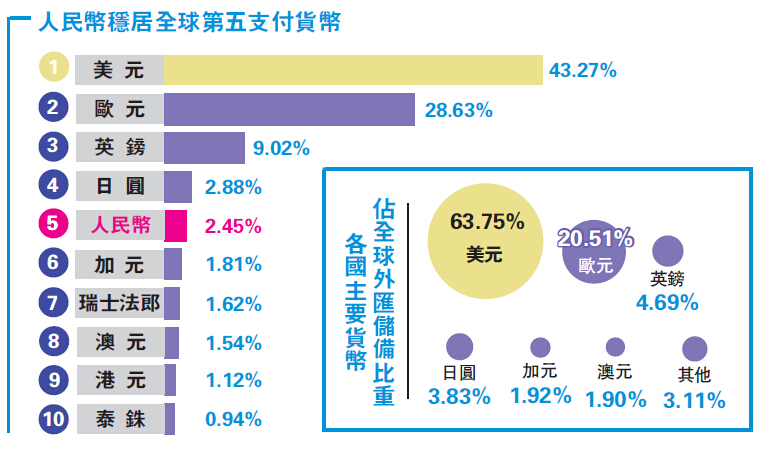 作為貿易等經常項目下的結算貨幣,人民幣的確在迅速擴大其國際存在感了。SWIFT去年8月數據顯示,作為全球貿易及投資中用來進行資金結算的貨幣,人民幣(2.79%)在去年八月首次超過日圓(2.76%),首次上升到第4位,還遠遠不如美元和歐元,而據SWIFT今年2月底的數據,人民幣(2.45%),再次落至日本(2.88%)后面居第五。