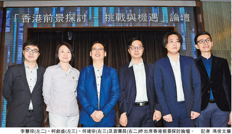 民間團體「香港群策匯思」昨早於觀塘如心艾朗酒店舉辦「香港前景探討--挑戰與機遇」論壇,主辦人民建聯區議員柯創盛邀來多位嘉賓出席,包括民建聯主席李慧瓊、香港政策研究所助理研究總監何建宗,以及民主思路總干事袁彌昌。