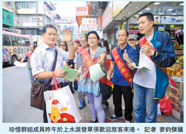 昨日是五一黄金周的第2日,往年迫爆的上水区人流明显减少,团体「珍惜群组」10多人昨午发起游行,成员戴上「香港欢迎你,陆港一家亲」的红色彩带,由港铁上水站步行至石湖墟,沿途向内地旅客派发传单,表示欢迎内地客来港消费。