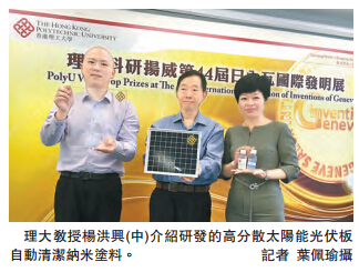 【香港商报网讯】记者叶佩瑜报道:灰尘容易积聚在玻璃、太阳能光伏板等,故需要涂上自动清洁涂料。理工大学研发的「高分散太阳能光伏板自动清洁纳米涂料」比现有涂料便宜几倍,且可在经钢化後的玻璃上有20年寿命,荣获日内瓦国际发明展的特别优异奖及金奖。