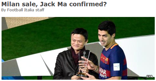 因为财政情况堪忧,加上俱乐部战绩不佳,贝卢斯科尼最近一直想要出售米兰部分股份,此前有消息指,马云的阿里巴巴打算买下米兰部分股份,但这名前米兰主席一直不肯放弃米兰的实际控制权,甚至还要操控转会,让不少投资客望而却步。而在日前接受采访时,马云也明确表示,他无意收购米兰,甚至还不知道米兰的所在地在哪里。