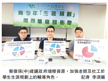 【香港商報網訊】記者李淇報道:社會近年積極推動中學生「生涯規劃」,希望年輕學子及早規劃自己職業生涯路向,教育局更於2014/15學年起每年向各中學提供50萬元津貼,助學校推動有關教育。香港青年動力協會於今年4月期間,就「生涯規劃」訪問550名中學生,卻發現有四成五受訪學生沒有聽過「生涯規劃」,有七成半更不知道政府正推廣有關教育。青年動力協會會長、工聯會立法會議員郭偉認為,這反映政府、學校對生涯規劃推廣不足,冀當局大力投放資源於生涯規劃上,把有關課程恒常化,監管學校的推行情況並適時檢討成效。
