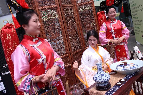 四川国际茶博会:女子穿宫廷服饰为茶商站台