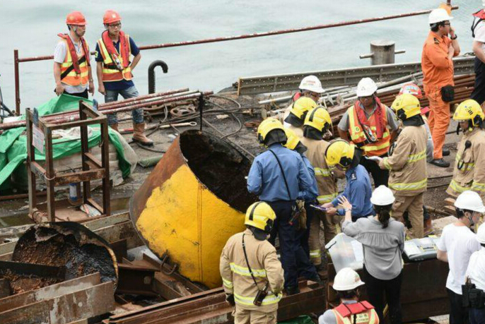 意外後,大批消防員、警員、海事處及工程人員登上一艘停泊在地盤岸邊的躉船調查,並圍著一個黃色浮波拍照蒐證。