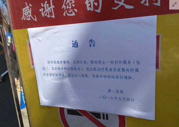 深陷魏則西死亡事件漩渦的武警北京總隊第二醫院貼出停診通知,宣布暫時停止一切對外服務。通知稱“因本院教育整頓,從即日起,暫時停止一切對外服務(包括門、急診接診和住院收治)。現住院治療患者及家屬向所屬科室領取探視證,憑證出入醫院。具體開診時間另行通知。”