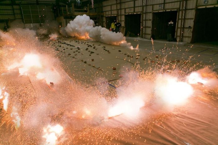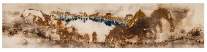 中国艺术家蔡国强在画作上铺设火药、点燃导火线进行爆破的创作,已经持续将近30年。今年4月,蔡国强在纽约一间仓库点燃火药,以烟火爆破留下的痕迹,在空白画布绘制一群动物们在湖边喝水、鸣叫的模样。