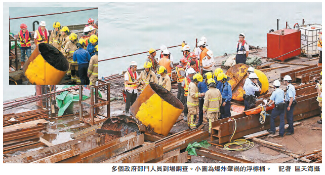 【香港商报网讯】记者区天海报道:中环湾仔绕道工程位於北角的建筑地盘发生罕见致命工业意外,两名工人昨晨在趸船上为一个俗称「锚头泡」的巨型金属浮标烧焊维修时突然发生猛烈爆炸,其中一名上班不足10天的南亚裔工人首当其冲惨被炸至重伤,送院抢救无效死亡,另一名本港工人则受轻伤,消防及海事处等多个部门正调查意外原因,有专家指不排除是浮桶内的防锈油漆所挥发气体遇火触发大爆炸。
