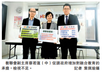 教联会促政府增加承担蔡若莲表示,融合教育推行已久,但政策仍有大量改善空间,包括:师资培训不足、教师缺乏足够时间照顾融合生等。她促请政府增加对融合教育的承担,并建议为学校提供足够人手与财政支援,包括:全面检视教师人手编制、加强教育心理学家到校支援及提供针对各类融合生需要的教学资源等。就特教统筹主任计划,她则批评由关爱基金拨款,被视为扶贫政策不合理,希望当局放宽计划的申请门槛。